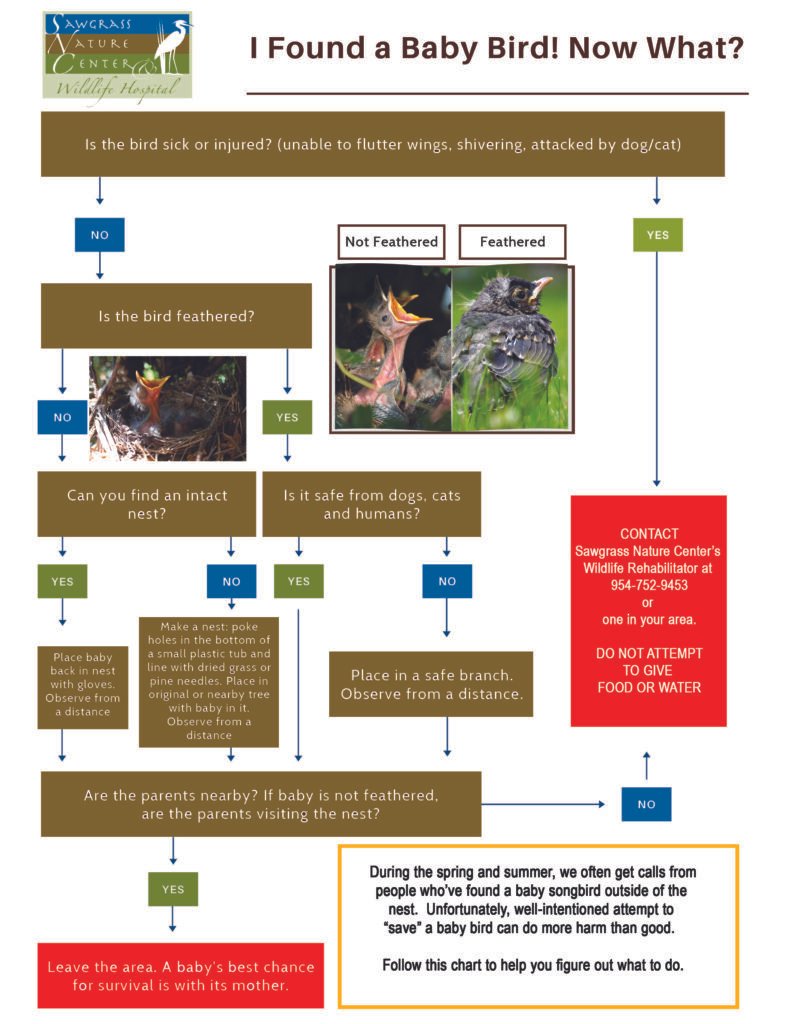 These birds should be returned to their nest whenever possible. If the original nest is destroyed, a temporary nest may be constructed nearby. Contact a wildlife rehabilitation facility for guidance.